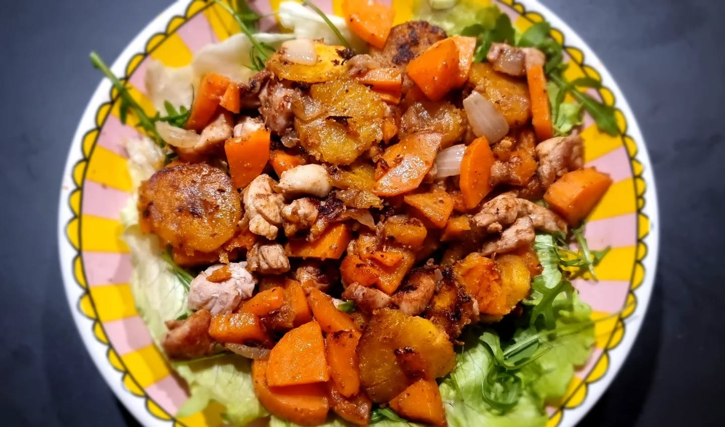 Leg op 2 borden een blad sla en leg daarop de rucola. Verdeel het kipmengsel over de twee borden en doe er evt wat gehakte noten over.