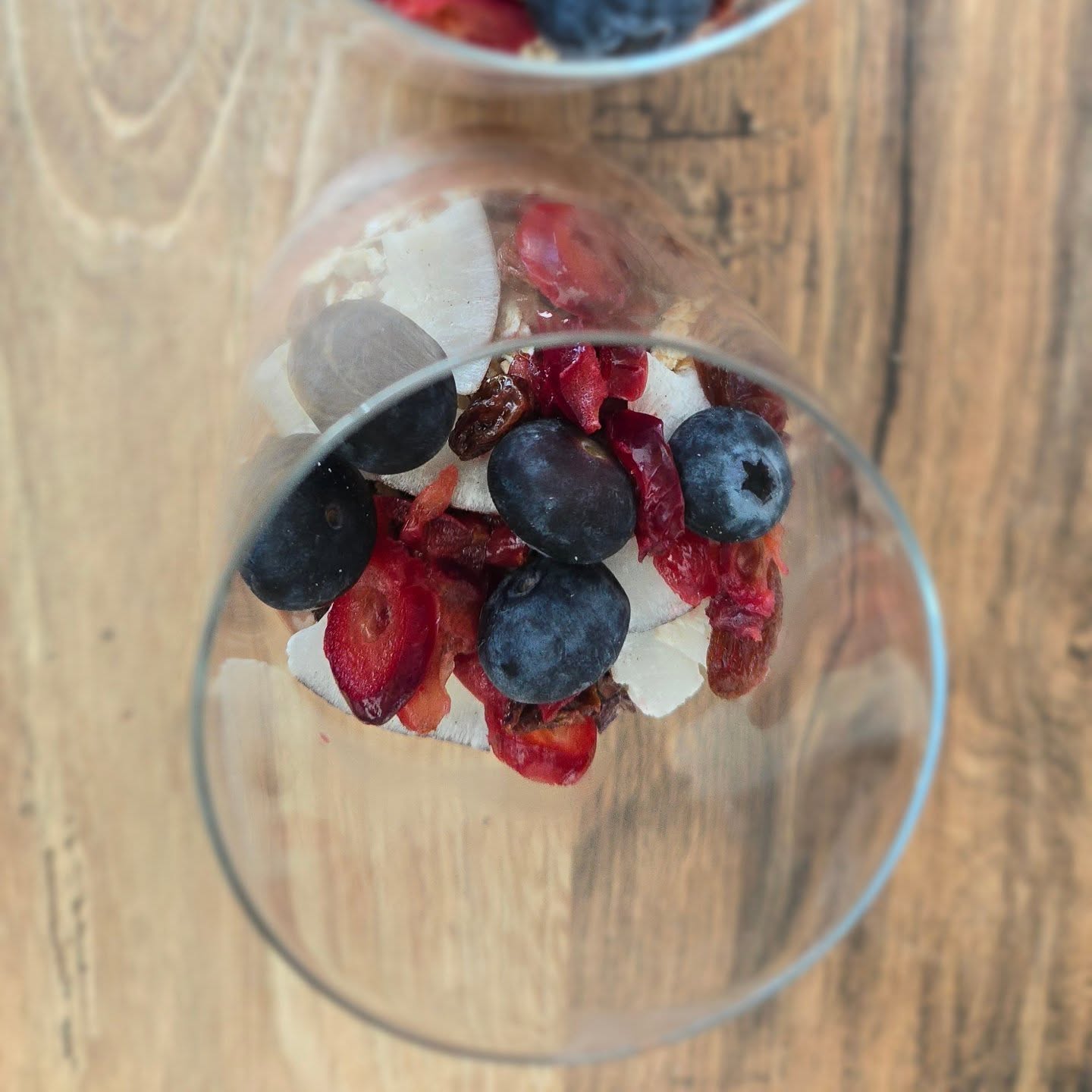 Schep de helft van dit mengsel in en hoog glas en strooi er wat havermout, fruit en kokos over.