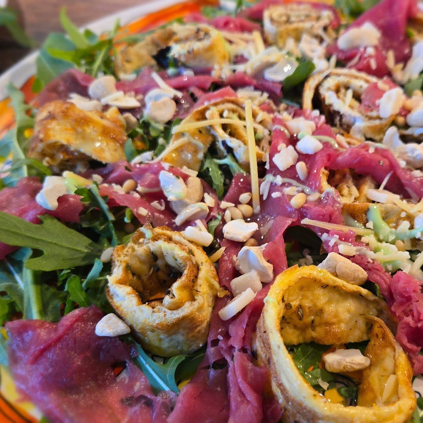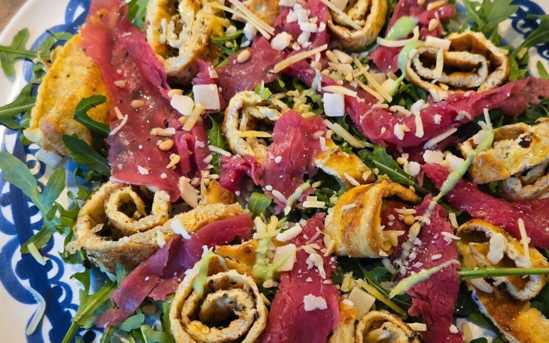 Rol op, snij in stukjes en maak een mooi bordje op met rucola, een halve verpakking Carpaccio, de omelet rolletjes, wat Cashewnoten, Pijnboompitten en geraspte kaas.