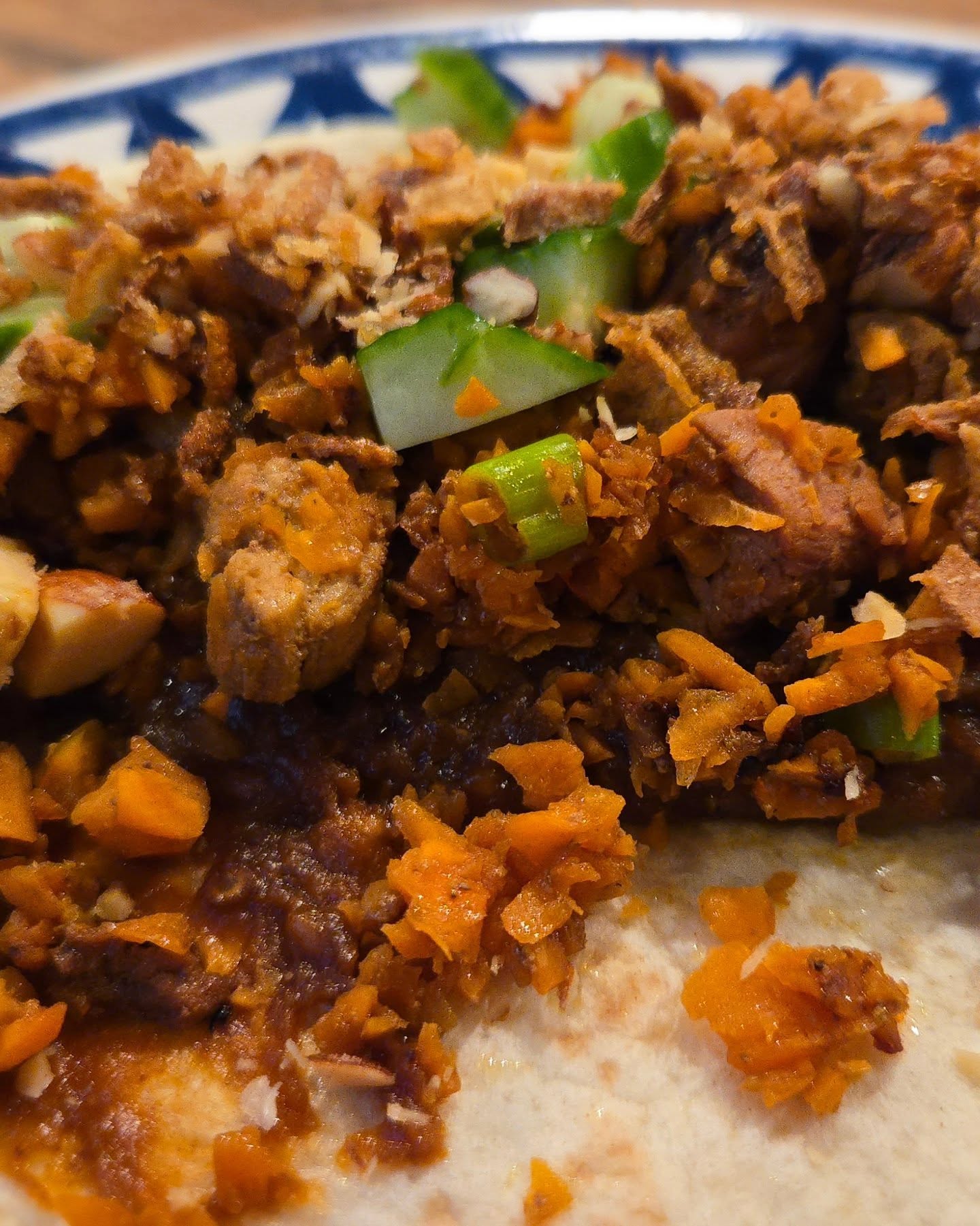 Verwarm de wraps, schep de varkenshaas steeds op de ene helft van de wrap, doe er komkommer over en pindasaus. Lekker met nootjes erover. Vouw dubbel of maak er zo’n mooie burrito van.